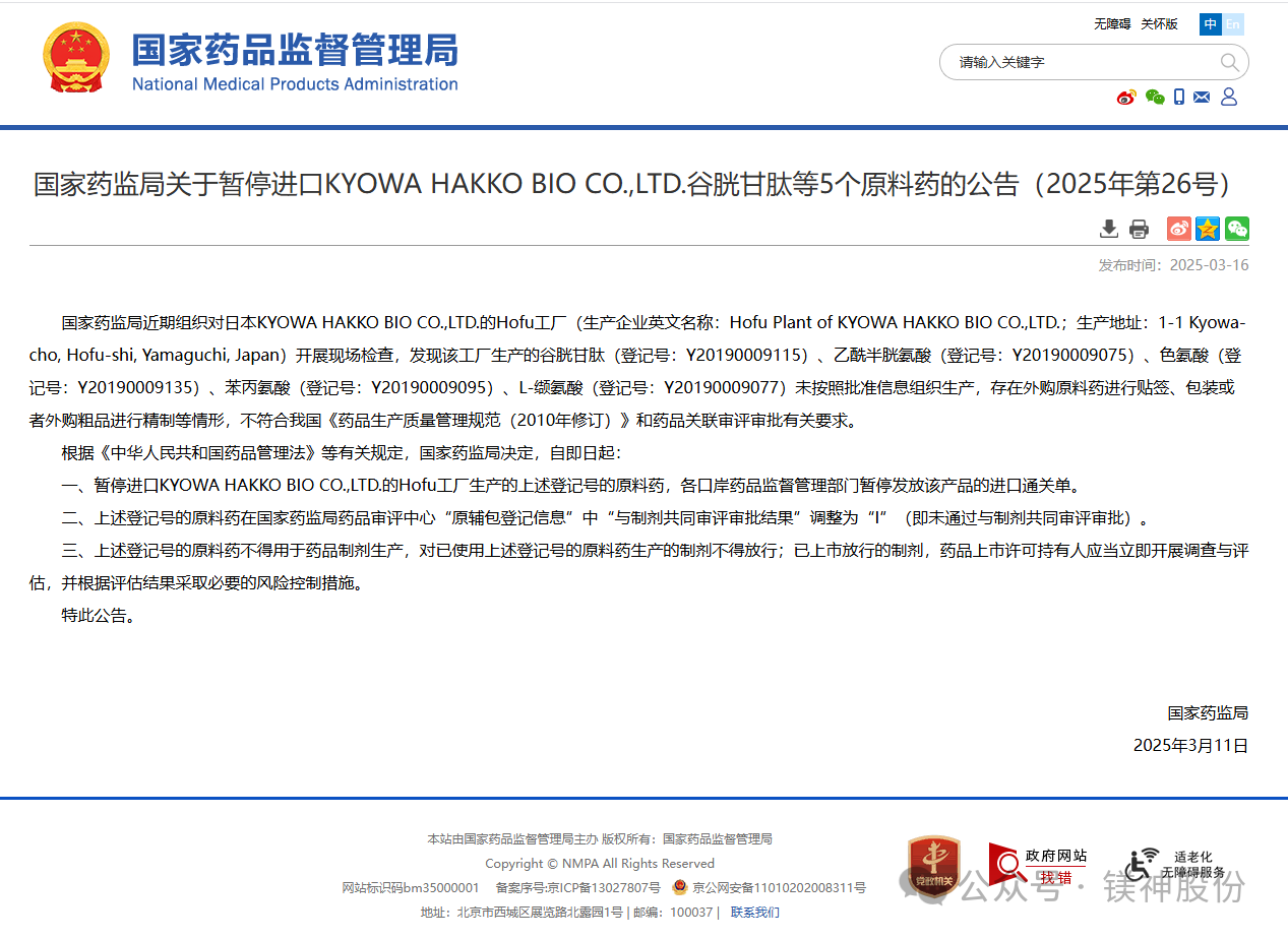 國家藥監(jiān)局暫停進口日本KYOWA HAKKO BIO CO.,LTD.原料藥,國
